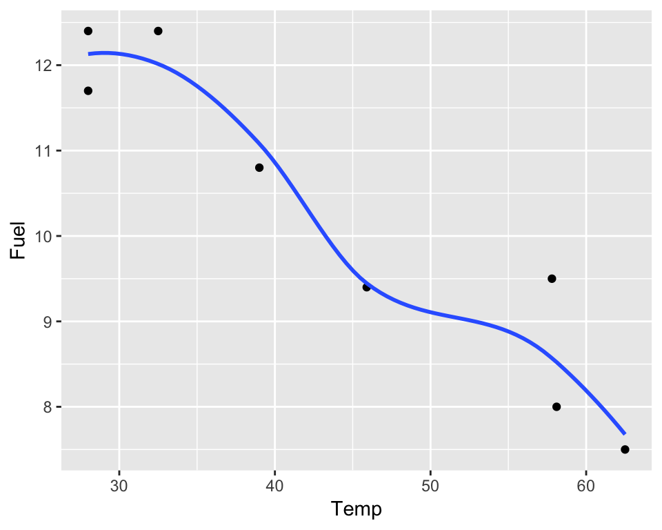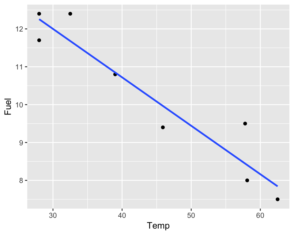 Information was recorded on fuel usage and average temperature (\(^oF\)) over the course of one week for eight office complexes of similar size. Data from Bowerman and Schafer (1990).