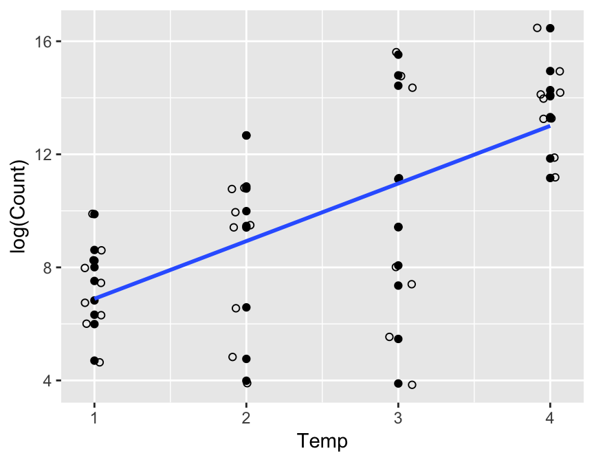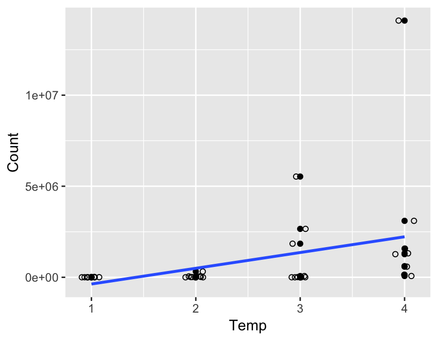 - Log transformed bacteria counts appear to have a linear relationship with temperature.