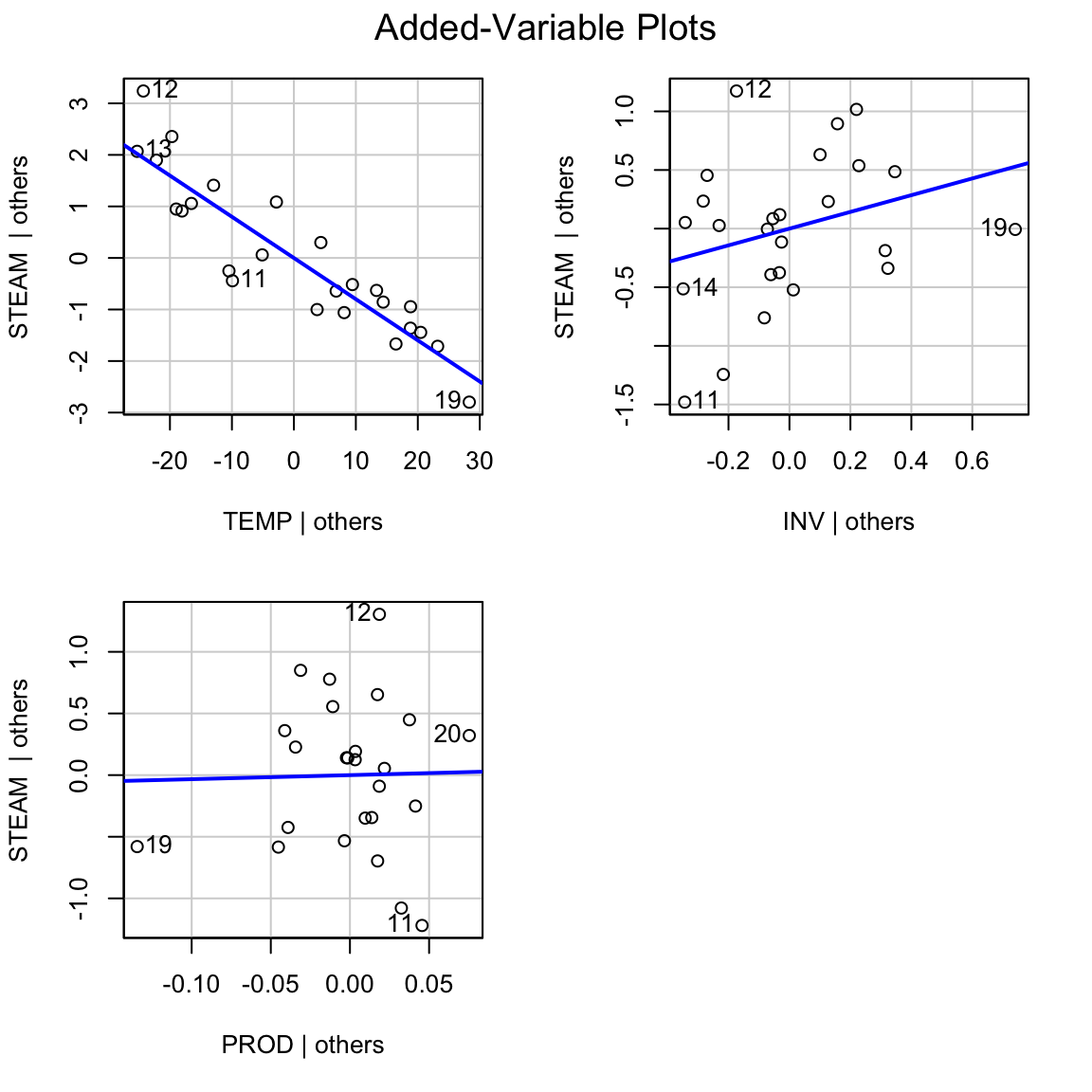 - Compute \(e\)(STEAM\(|\) TEMP, INV), i.e. the residuals from regression of STEAM on TEMP and INV.