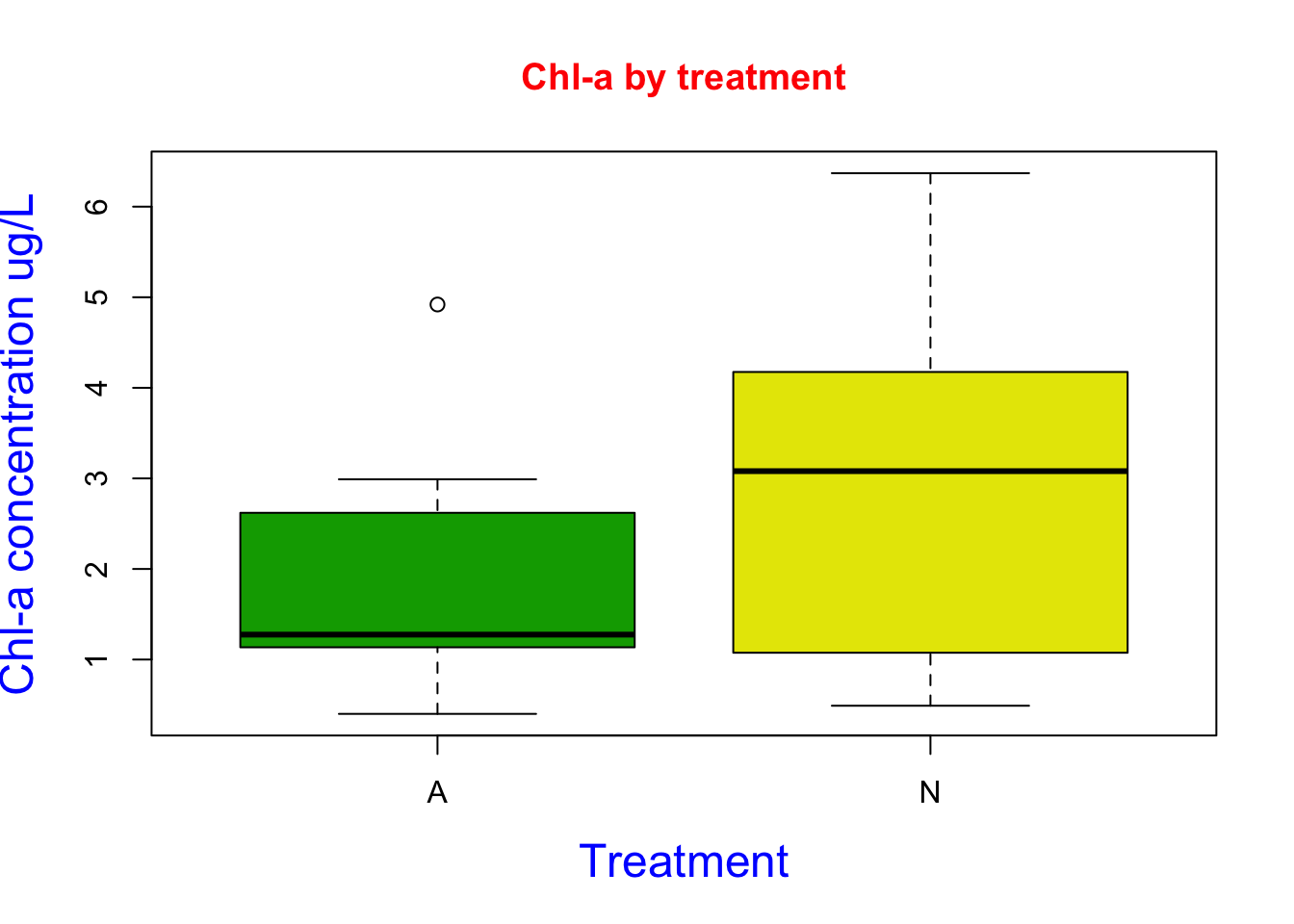 Here I created a boxplot using chl-a and treatment data. I used the col argument to designated the colors to terrain.color package. I added a title and axis labels using the main, xlab, and ylab arguments. I then changed the color of the labels using the col.main and col.lab argument. I then changed the font size of the labels using the cex.lab argument. Based on the figure we can see our treatment N increased chl-a concentrations.