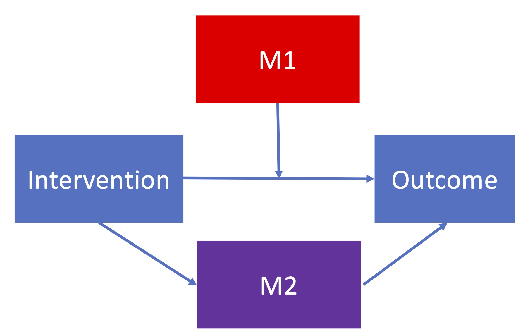 2. M refers to the case when something acts upon the relationship between intevention and outcome, and changes its strength. Mediation|moderation