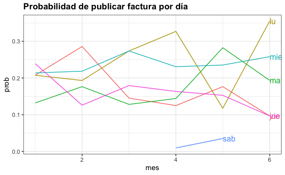 Vemos cómo los lunes, martes y miércoles la probabilidad de publicar una factura es más alta del 20%. Sin embargo, vemos cómo los jueves y viernes la probabilidad es de entre 10% a 15%. Como inversionista, sería más eficiente estar pendiente los primeros días de la semana.