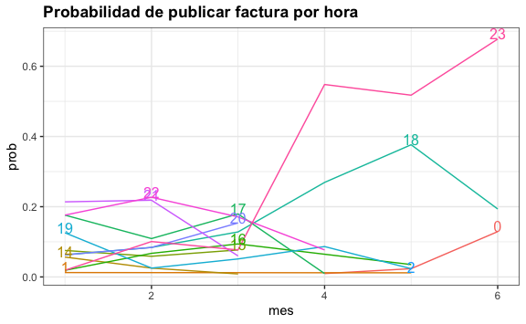 Ahora que ya tenemos tanto el histórico de la publicación de facturas podemos calcular la probabilidad de publicación por día y por hora para analizar posteriormente si hay una tendencia a publicar en algún determinado día u hora.