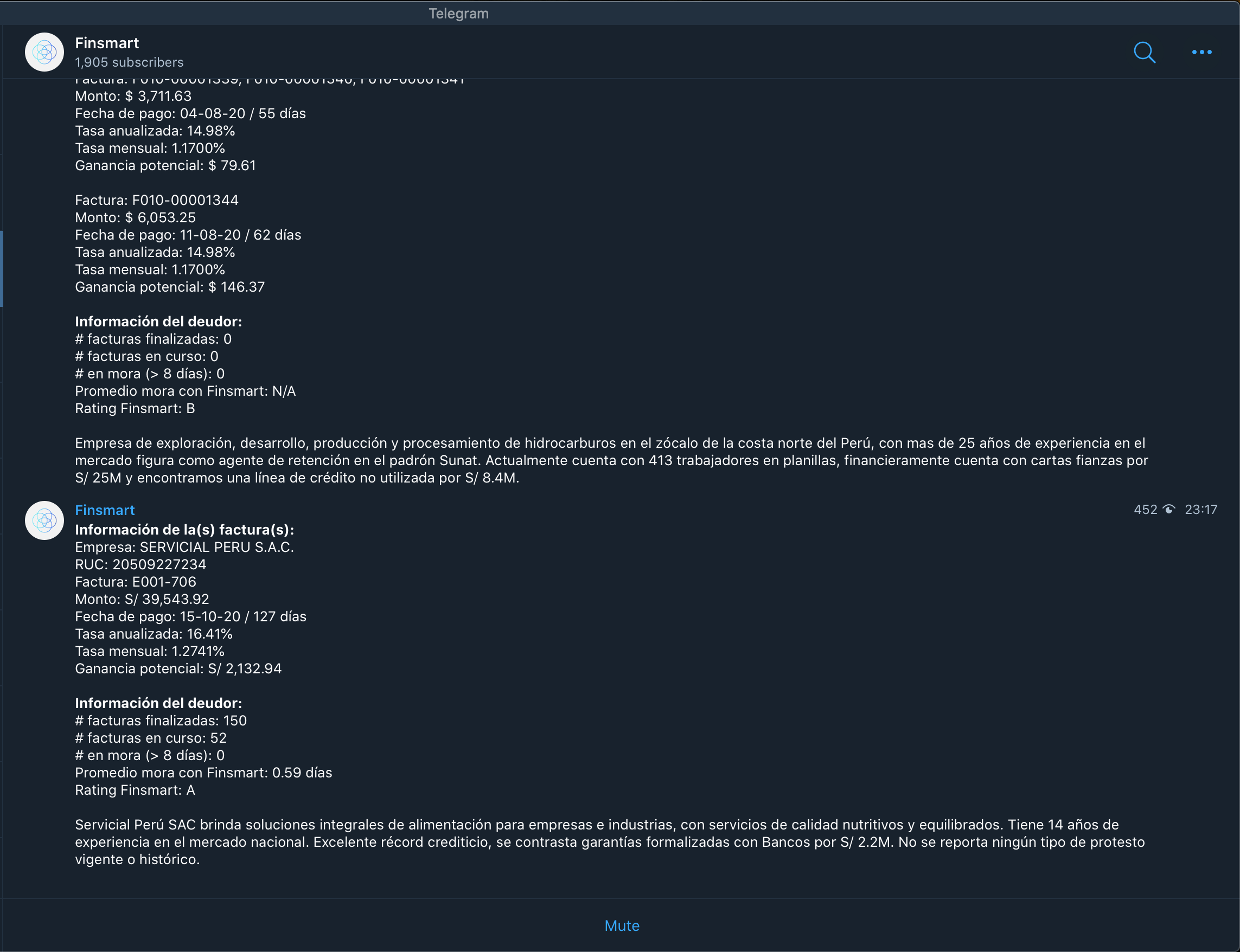 Una vez estamos inscritos en la web y cargamos dinero a nuestra billetera virtual podemos empezar a invertir. La forma en cómo notifican cuando hay facturas dónde invertir es a través de un grupo en Telegram: