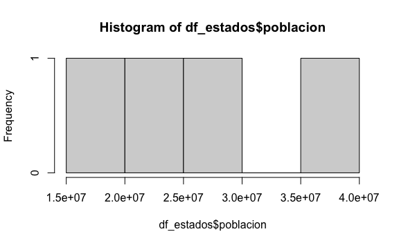 También podemos usar la función hist() para crear un histograma de una columna numérica, como la columna poblacion en el data frame df_estados.
