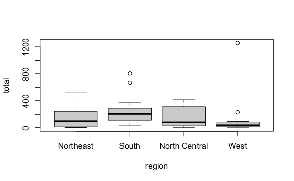 El oeste (West) tiene el menor rango de datos y tiene dos outliers. El sur (South) tiene la mediana más alta entre todas las regiones.