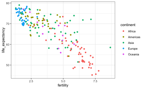 Vemos al extremo izquierdo algunas regiones en África, y al extremo derecho Europa y EEUU. Recordemos que podemos agregarle color de acuerdo a a alguna variable. En este caso agreguemos color en base al continente:
