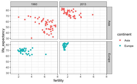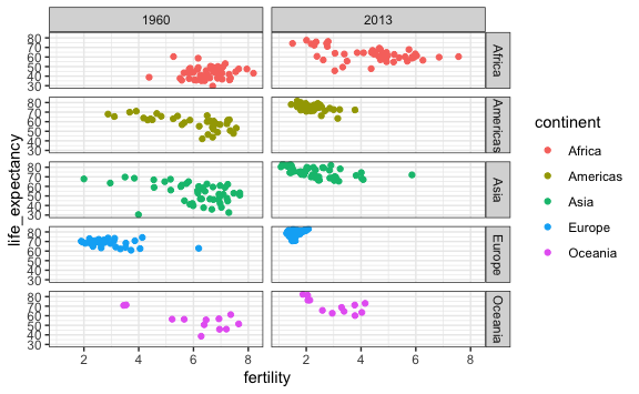 Ahora vayamos a hacer un zoom. Dentro de cada continente tenemos regiones, por ejemplo en las Américas tenemos Sudámerica, Centro América, Norteamética, y así con cada continente. Cambiemos la variable continent por region.