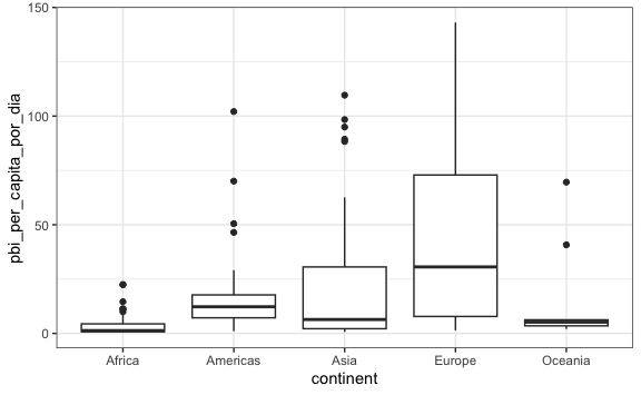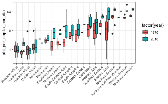 Vemos ahora más claramente con data comparable cómo hay más países dentro de la región en desarrollo que incrementaron el PBI per cápita, mucho más que los países en desarrollo. Pero aun esta primera inferencia es visual, necesitamos comparar cómo cambió la mediana, el rango, etc. Para ello usaremos un diagrama de cajas muy similar al anterior, pero esta vez editaremos geom_boxplot() para que nos muestre en un solo gráfico cómo ha cambiado desde 1970 a 2010 cada región.