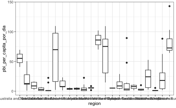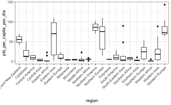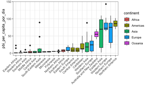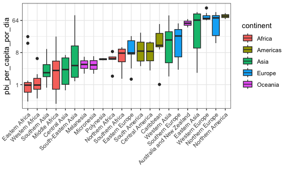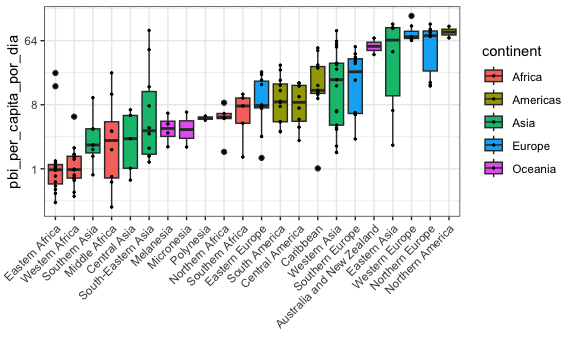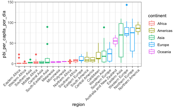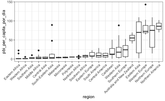 #> [21] "Western Asia" "Western Europe"Utilizaremos la función reorder() para cambiar el orden de los factores y dado que estamos alterando el dataframe lo tendríamos que usar dentro de la función mutate(). La función reorder() nos pide como primer atributo el factor a reordenar, luego el vector que tomaremos en cuenta y finalmente una función de agrupación. Por ejemplo, que ordene en base a la mediana de cada región (visualmente recordemos que es la línea gruesa dentro de cada caja):
