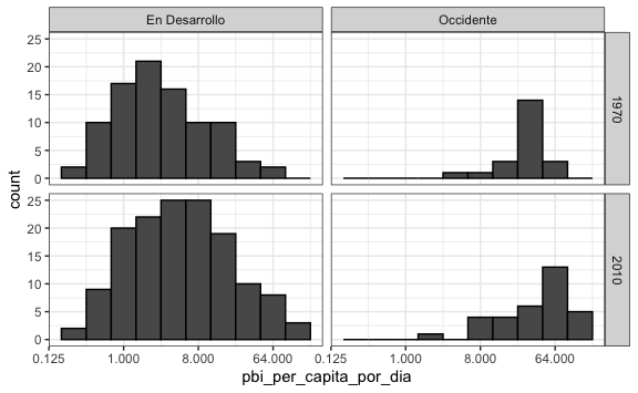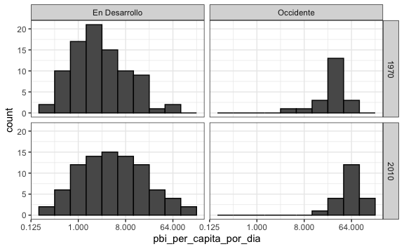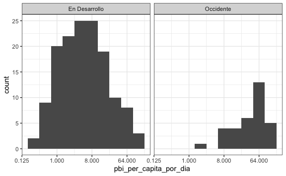 #> 6 En DesarrolloAhora que ya tenemos cómo diferenciar a los países podemos ver su distribución hasta encontrar cómo responder a nuestra pregunta. Empezamos creando un histograma con escala logarítimica en el eje-x y lo separamos usando facet_grid en base al grupo al que pertenece:
