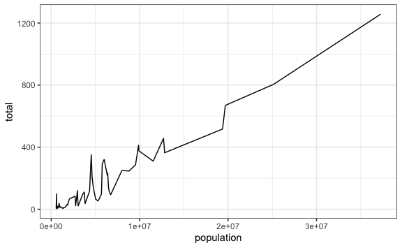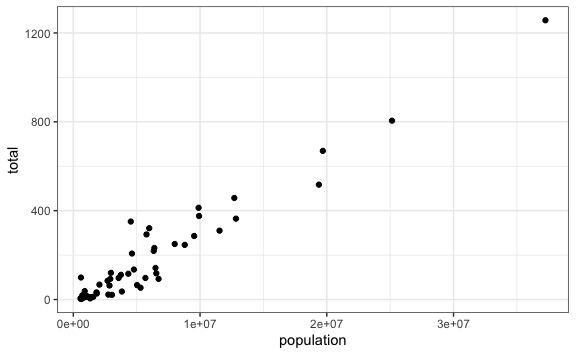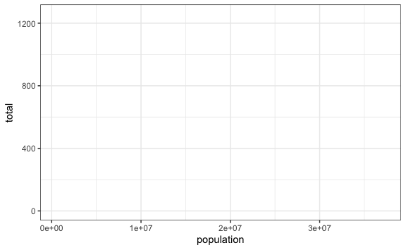 Primero vamos a enfocarnos en la estética básica, esto es: qué va en el eje x y qué ponemos en el eje y. Para ello usaremos la función aesthetic (estética en inglés) que en R es aes(). Por ejemplo, agreguemos en el eje x la data de population y en el eje y la data del total. No tenemos que usar el accesador $ porque la función aes toma como referencia la tabla murders antes del pipeline.
