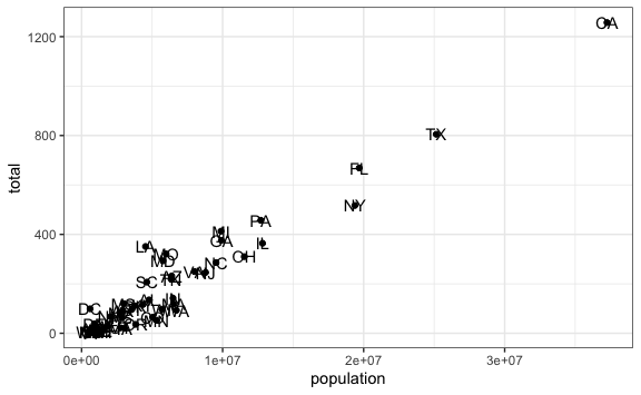 Hasta este punto hemos creado el mismo gráfico de dispersión que vimos en el capítulo anterior. La potencia de ggplot está en la facilidad para agregar componentes. Por ejemplo, si en el gráfico de dispersión queremos que cada punto tenga el nombre del estado, o mejor aun la abreviación abb, solo tenemos que agregarlo como atributo label dentro del aes y agregar la capa geom_text().