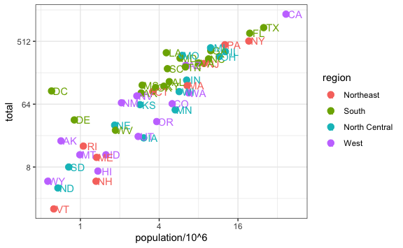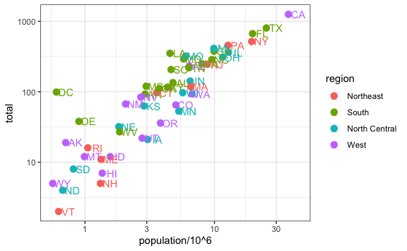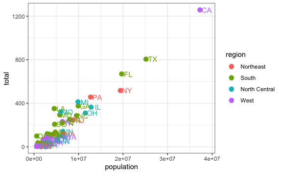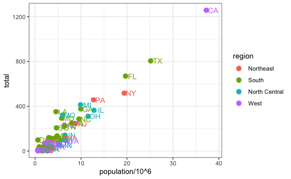 aes(x = population/10^6, y = total, label=abb, color=region) +