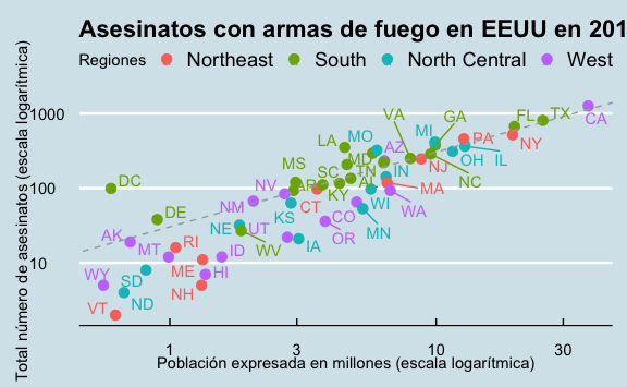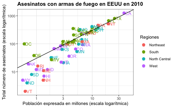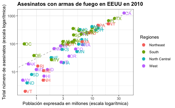 O podríamos calcular el ratio de asesinatos por millón de habitantes en todo EEUU y dibujar una diagonal de referencia. En el caso de la diagonal tenemos que expresarlo en la misma escala del eje, por ende tenemos que convertirlo a log10.