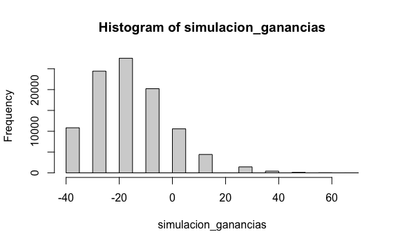 #> [1] -40Finalmente, no solo una persona jugará. Repliquemos esta muestra unas 100,000 veces para simular la cantidad de jugadores que tendríamos en un trimestre.