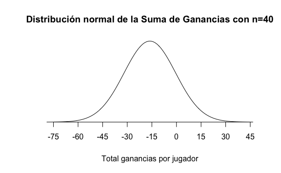 Si replicamos este lenguaje a nuestro ejemplo sería: El teorema del límite central nos indica que si tomamos muestras de 40 jugadas para cada jugador y luego calculamos para cada jugador el total que ganó, entonces encontraremos que la distribución de la cantidad ganada por muchos jugadores se aproxima a una distribución normal.