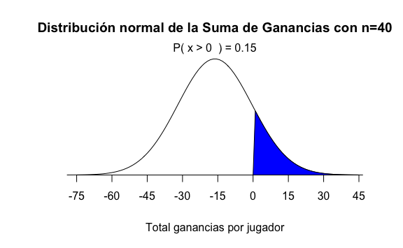 Por ejemplo, si queremos saber ¿cuál es la probabilidad de que un jugador gane dinero luego de jugar 40 veces en la ruleta tendríamos que calcular la probabilidad de que \(S\) sea mayor que cero, representada por el área sombreada en azul: