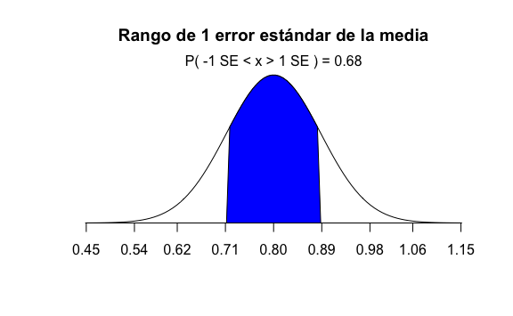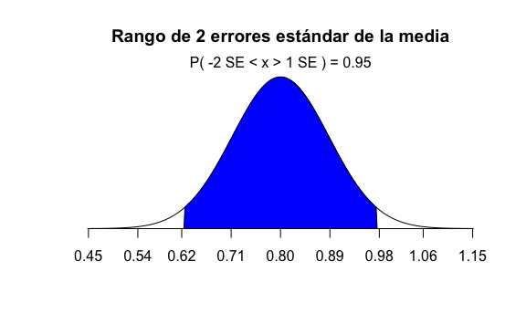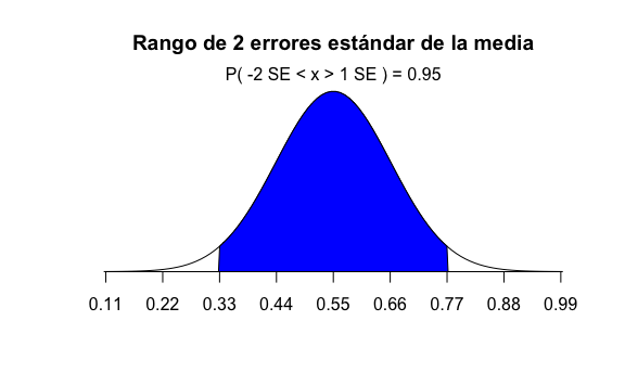 Y es que un intervalo de confianza del 95% nos indica que hay un 95% de probabilidad de que en el intervalo que generemos se incluya al parámetro \(p\) que queremos estimar. Esto no es más que otra forma de indicar que tenemos que construir un intervalo considerando el margen de error, es decir dos errores estándar alrededor de nuestra media muestral.