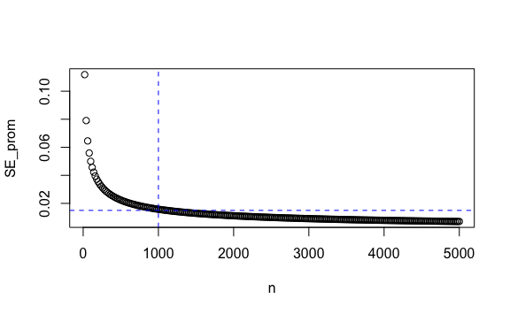 Vemos que el error estándar es dos veces el error estándar del promedio, que depende de \(p\), y ya hemos encontrado anteriormente una estimación para no depender de \(p\) sino de la media de nuestra muestra. Así que utilizaremos: