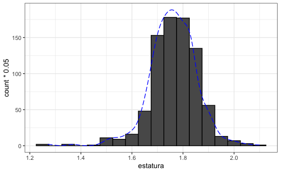 geom_density(aes(y = ..count..*0.05), colour = "blue", lty = 5)