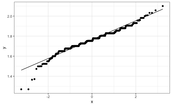 Los puntos parecen caer sobre una línea recta. Esto nos da un buen indicio que suponer que nuestra data de estaturas proviene de una población que es distribuida de forma normal es razonable. Observemos que el el eje-y traza los cuantiles empíricos y eje-x traza los cuantiles teóricos. Éstos últimos son los cuantiles de la distribución Normal estándar con media 0 y desviación estándar 1.