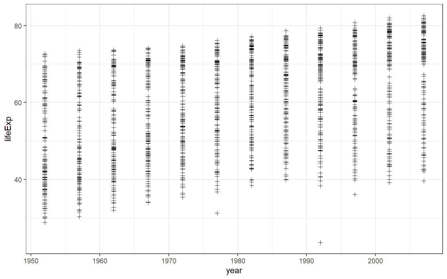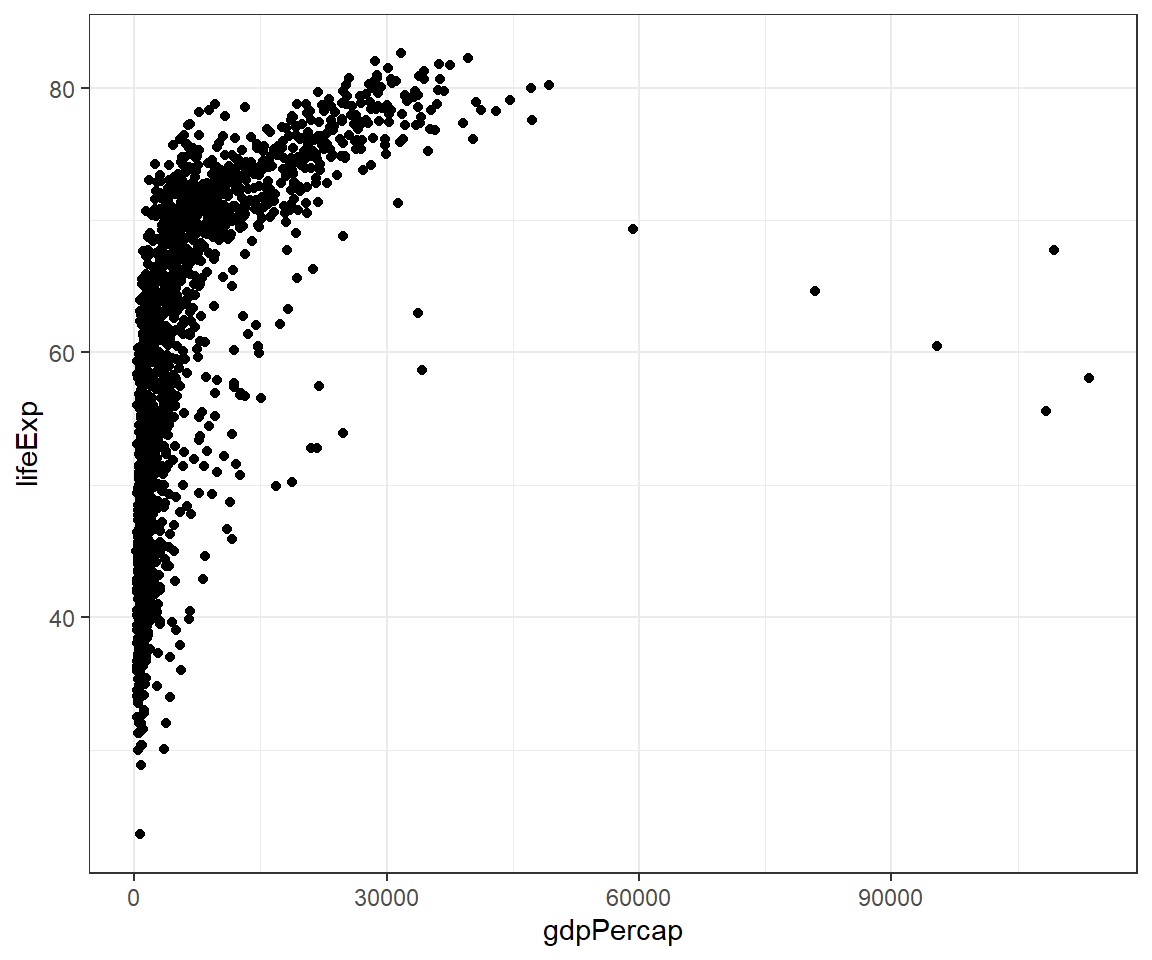 We can customize many aspects of the plot using ggplot2 package. For example, from gapminder dataset, we choose gdpPerCap and log it (to reduce skewness) and lifeExp, and make a scatterplot.