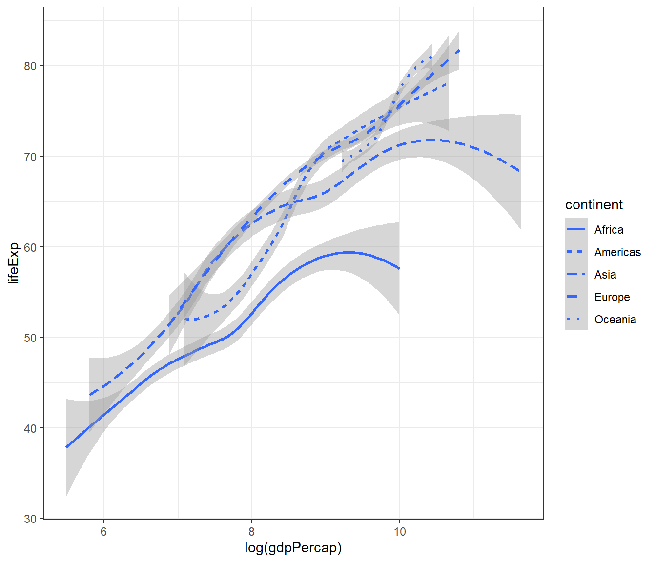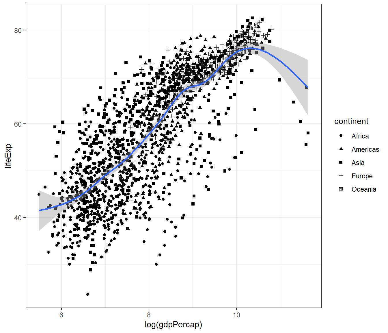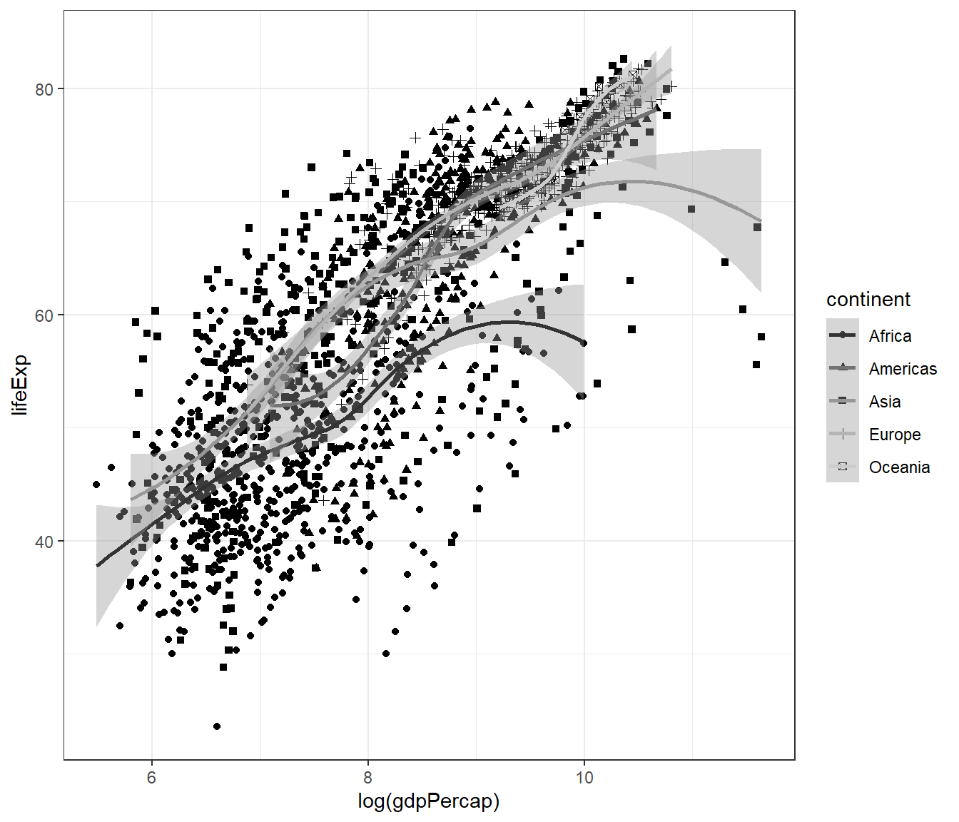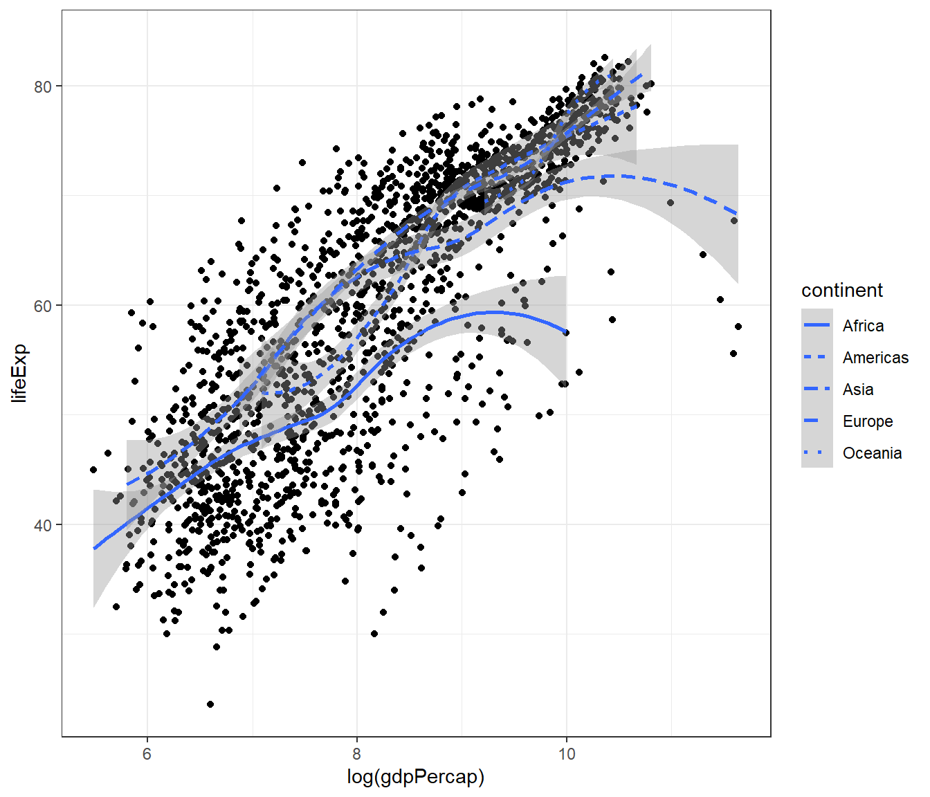 theme_bw()## Warning in geom_smooth(mapping = aes(line = continent), se = FALSE): Ignoring