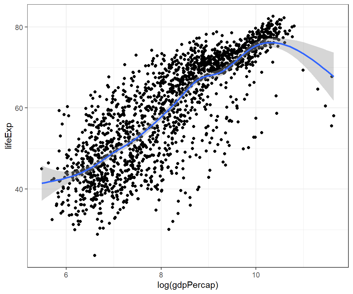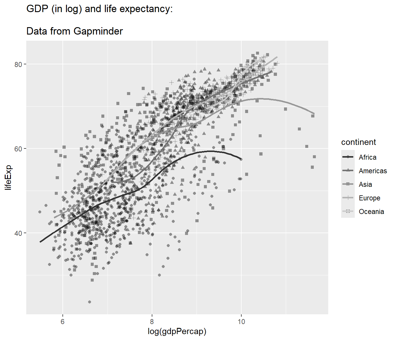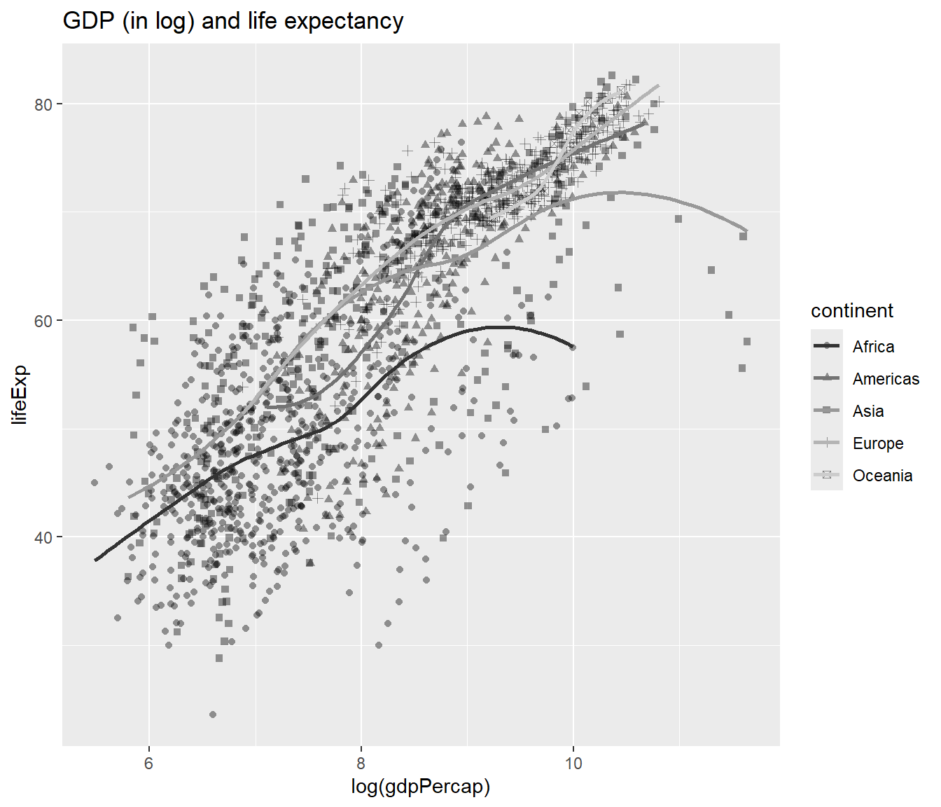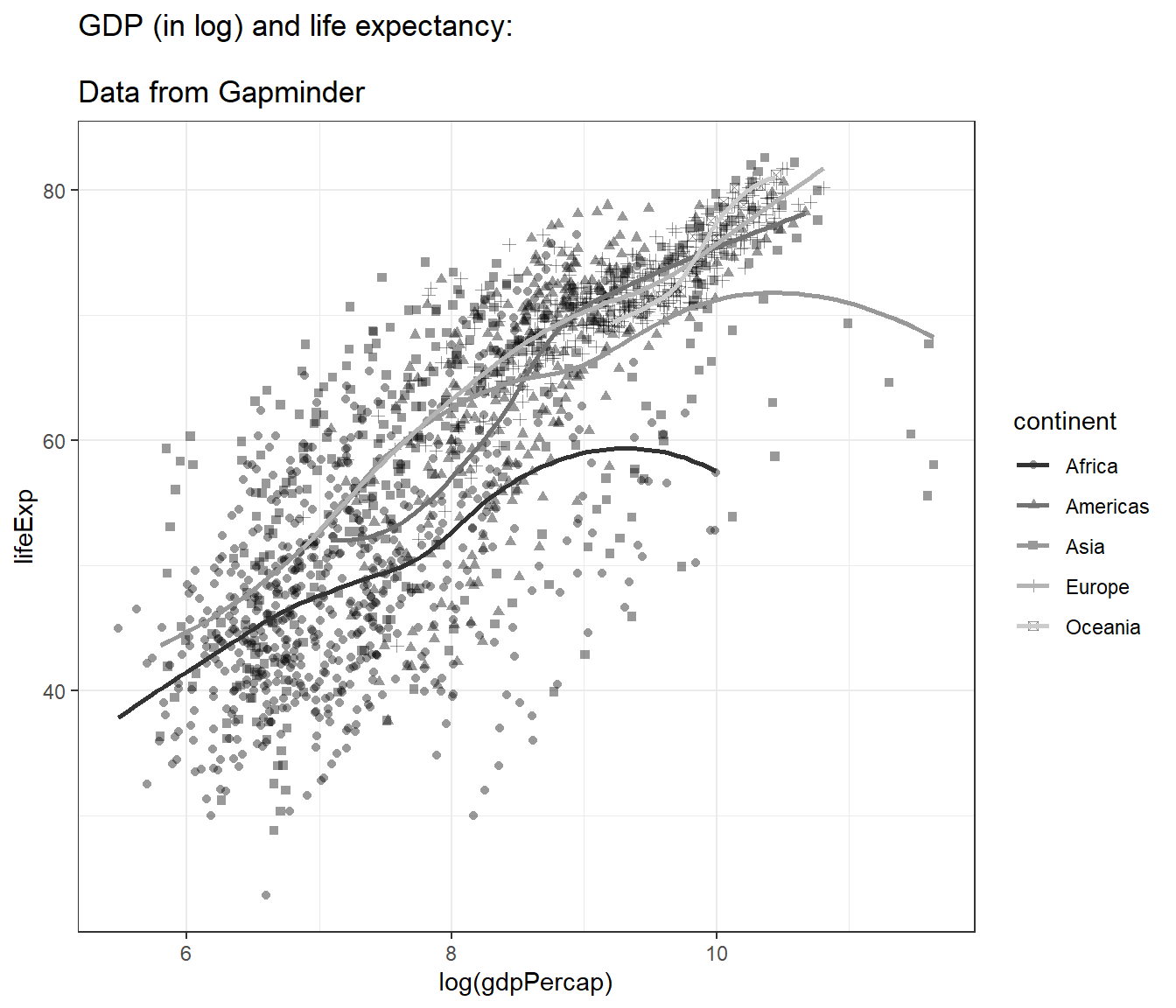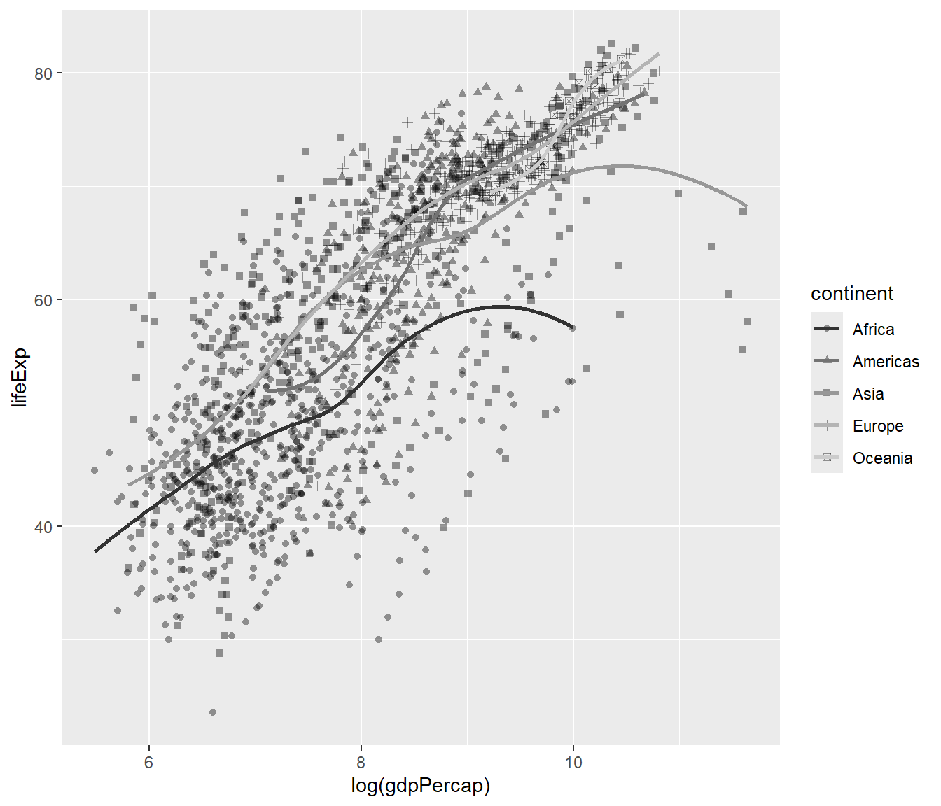 theme_bw()## Warning in geom_smooth(mapping = aes(line = continent), se = FALSE): Ignoring