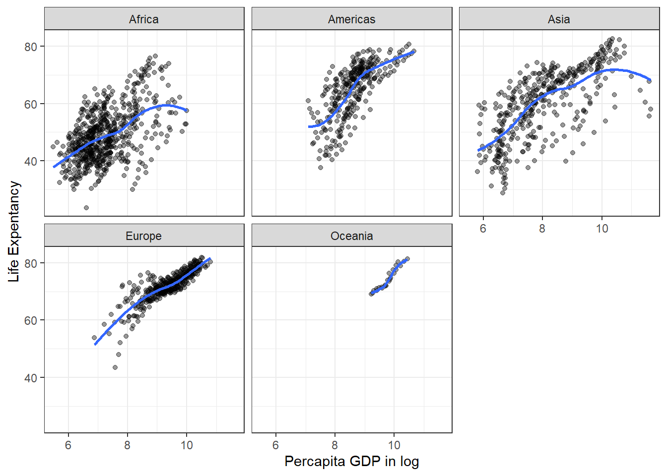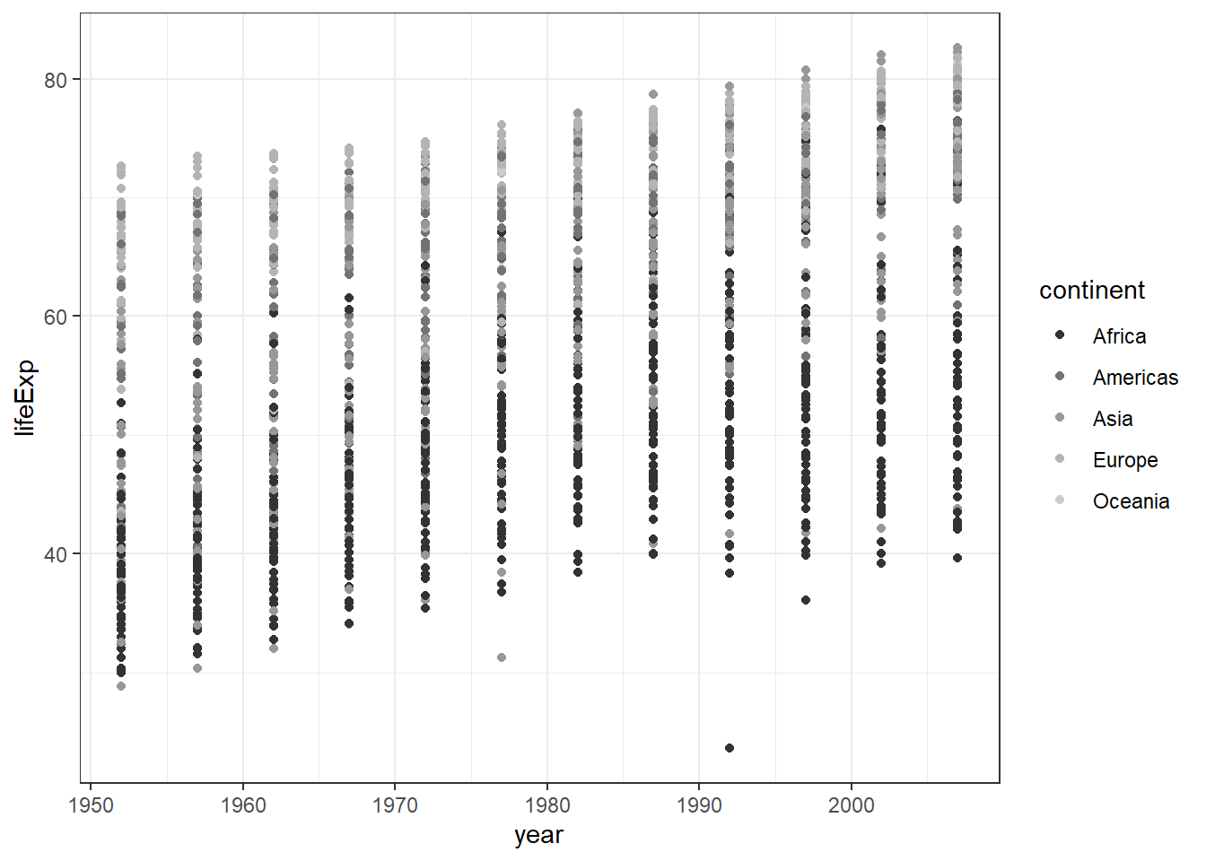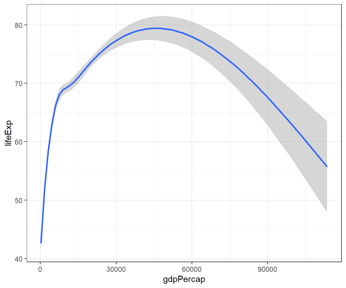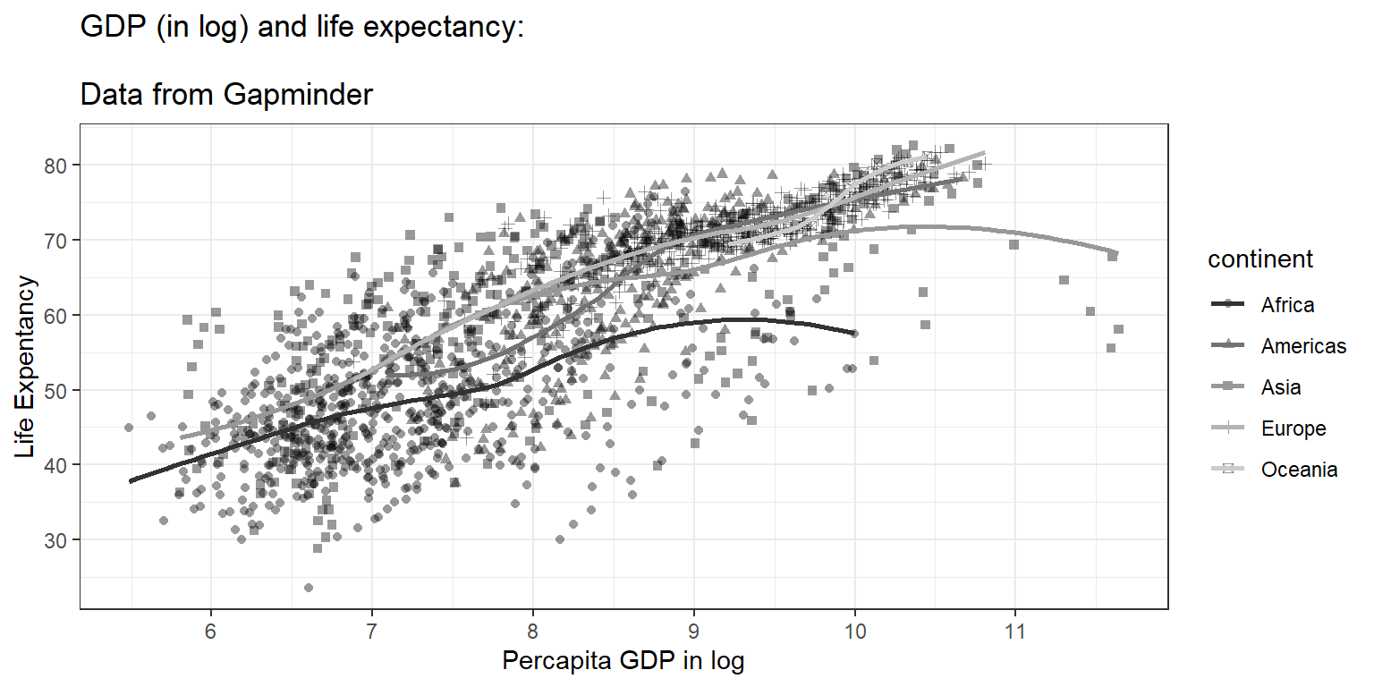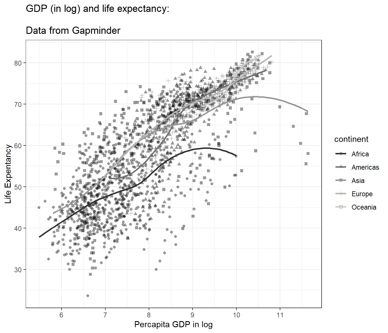 theme_bw()## Warning in geom_smooth(mapping = aes(line = continent), se = FALSE): Ignoring