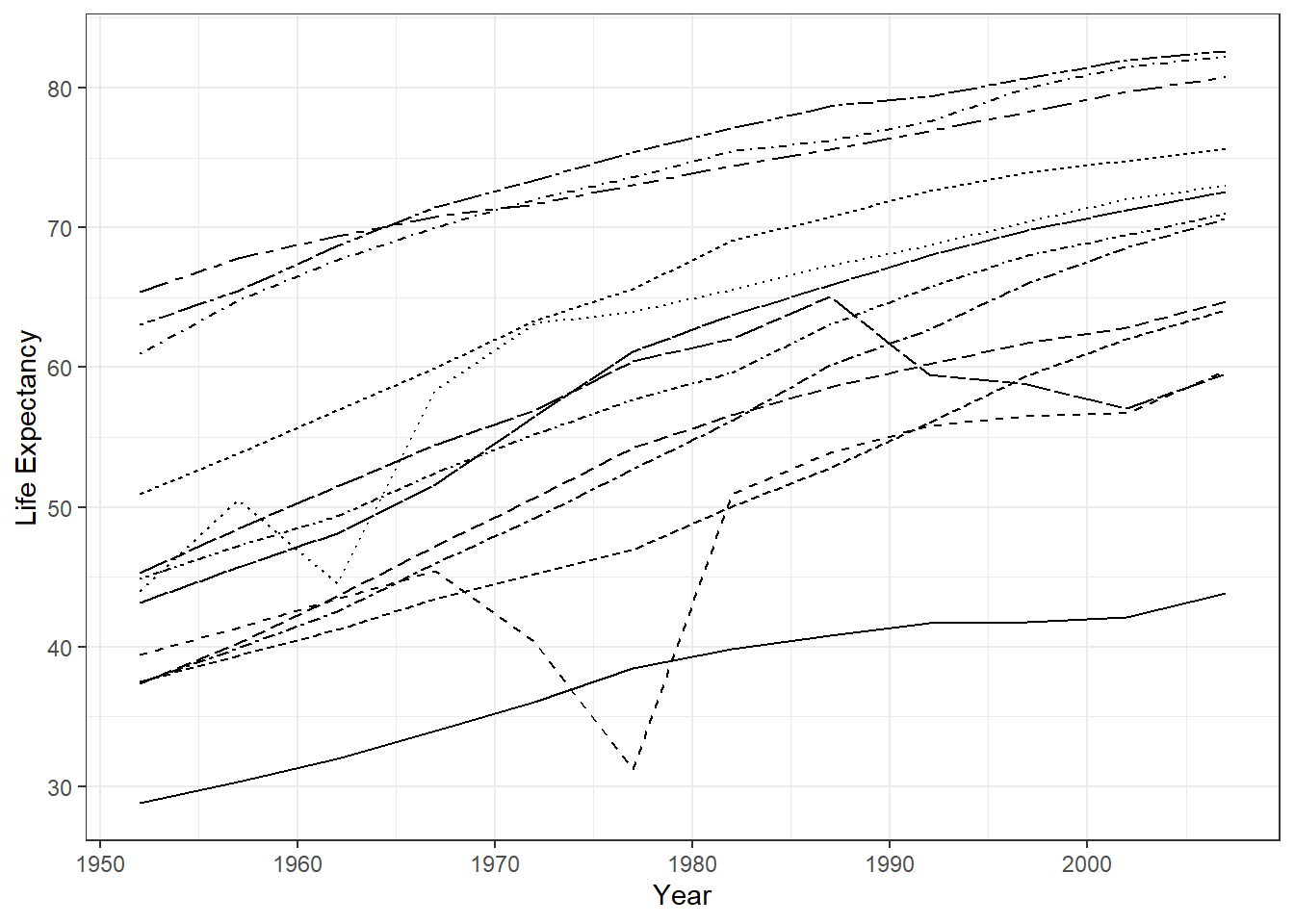 ggplot(mapping = aes(x = year, y = lifeExp, linetype = country)) +