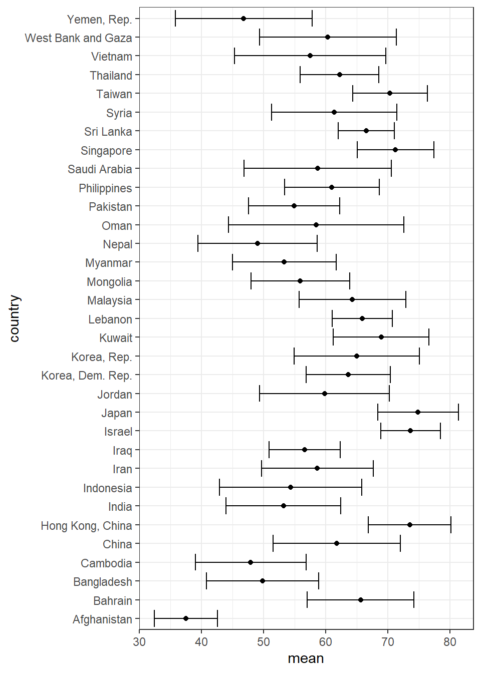 Our approach is use filter to choose Asia continent only filter(). Then generate the mean and SD for life expectancy using mutate(). Next is to plot the scatterplot (country vs mean life expectancy) geom_point() and then plot errorbar geom_errorbar()