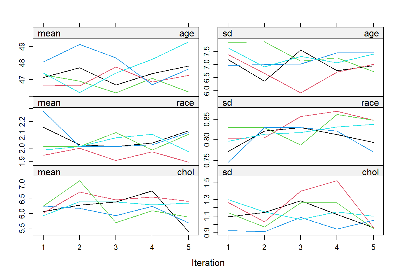 Flow of the multiple imputation is quite similar to the single imputation since we are using the same package. The number of imputed set, m by default is set to 5 in mice(). In general, the higher number of m is better, though this makes the computation longer. For moderate amount of missing data, m between 5 to 20 should be enough. Another recommendation is to set m to the average percentage of missing data. However, for this example we going to run the default values.