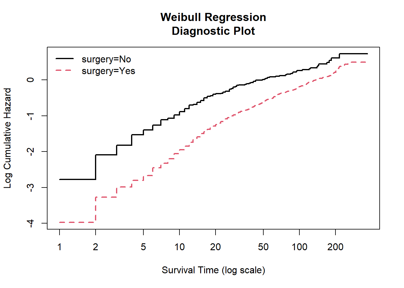 From the Weibull regression diagnostic plot, we can see that the lines for surgery status (yes and no) are generally parallel and linear in its scale. Thus, we can assume that the Weibull model is fit.
