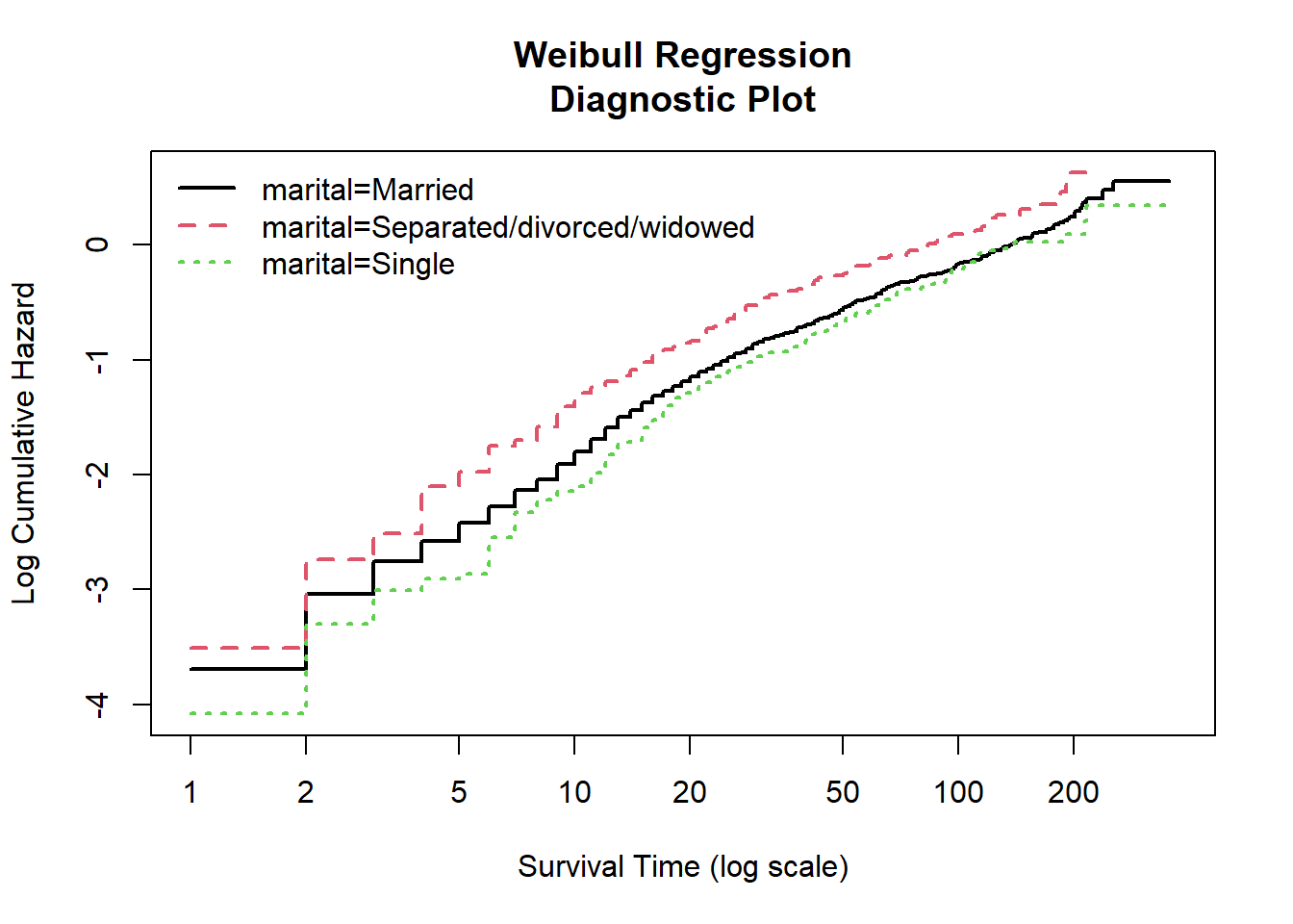 The Weibull regression diagnostic plot for marital status also shows rather parallel and linear lines. Again, we can assume that the Weibull model is fit.