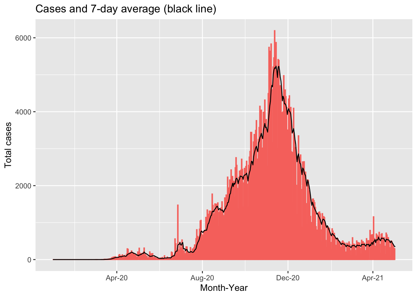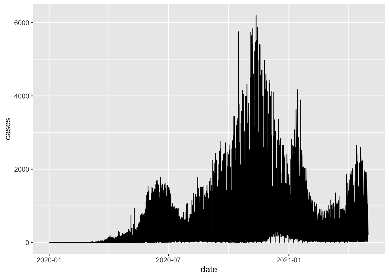 This function provides useful information which we can use for building our approach to designing an analysis workflow. For example, we can see from the summary of the date variable that the first record (Min) is from 2020-01-01 and the last record (Max) is from 2021-05-03, For the cases variable, the maximum number of cases recorded on one day was 6,195.