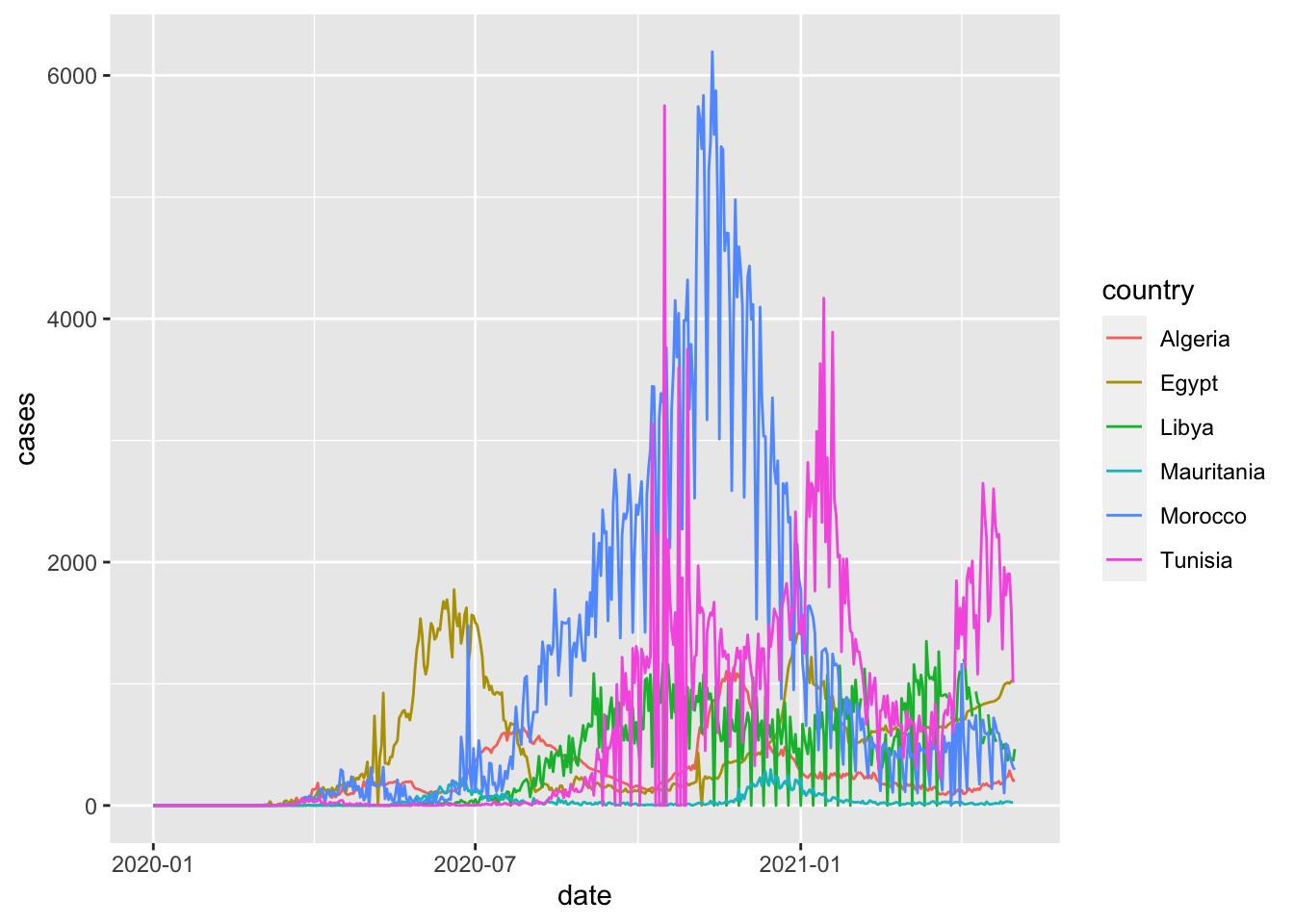 mutate(date=lubridate::ymd(date_format))We have renamed AFRICAN_REGION and COUNTRY_NAME as region and country.