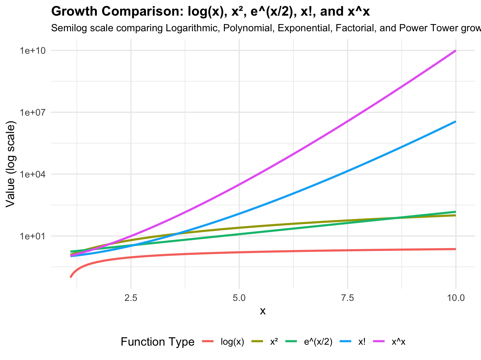 or verbally: Logarithmic < Polynomial < Exponential < Factorial < Power Tower