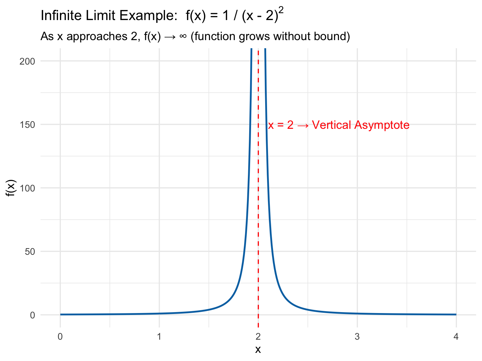 Infinite Limits (Vertical Asymptote) occur when the function grows without bound as it approaches a certain point. We are asking: “What happens to \(f(x)\) as \(x\) gets close to some point \(a\)?”