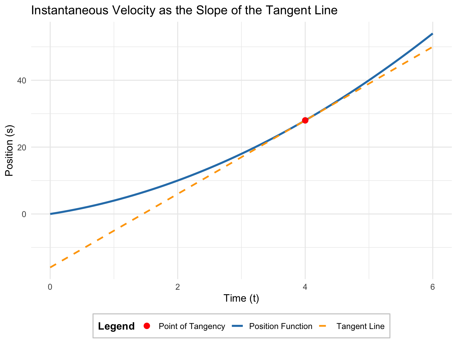 If we plot \(s = f(t)\), the instantaneous velocity at time \(t\) is represented by the slope of the tangent line to the curve.