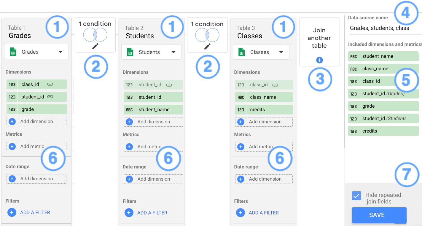 Programmer database menggunakan pernyataan join SQL untuk menggabungkan data dari tabel yang berbeda. Di Looker Studio, Anda dapat menggabungkan data tanpa menulis kode. Sebagai gantinya, Anda menggunakan editor penggabungan (blend editor) untuk mengatur join, seperti yang ditunjukkan pada tangkapan layar berikut: