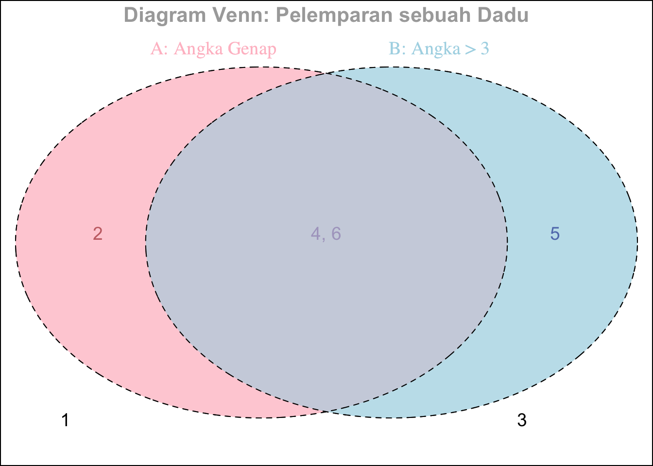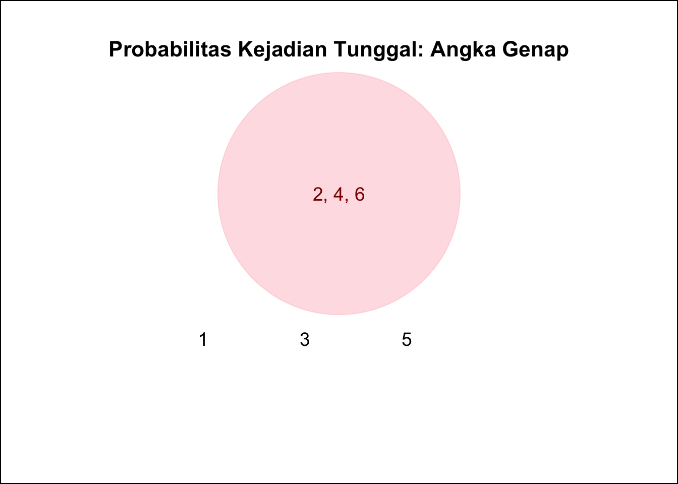 - Contoh 1: Kejadian \(A\) adalah “angka genap” saat melempar dadu, maka \(Genap = \{2, 4, 6\}\).