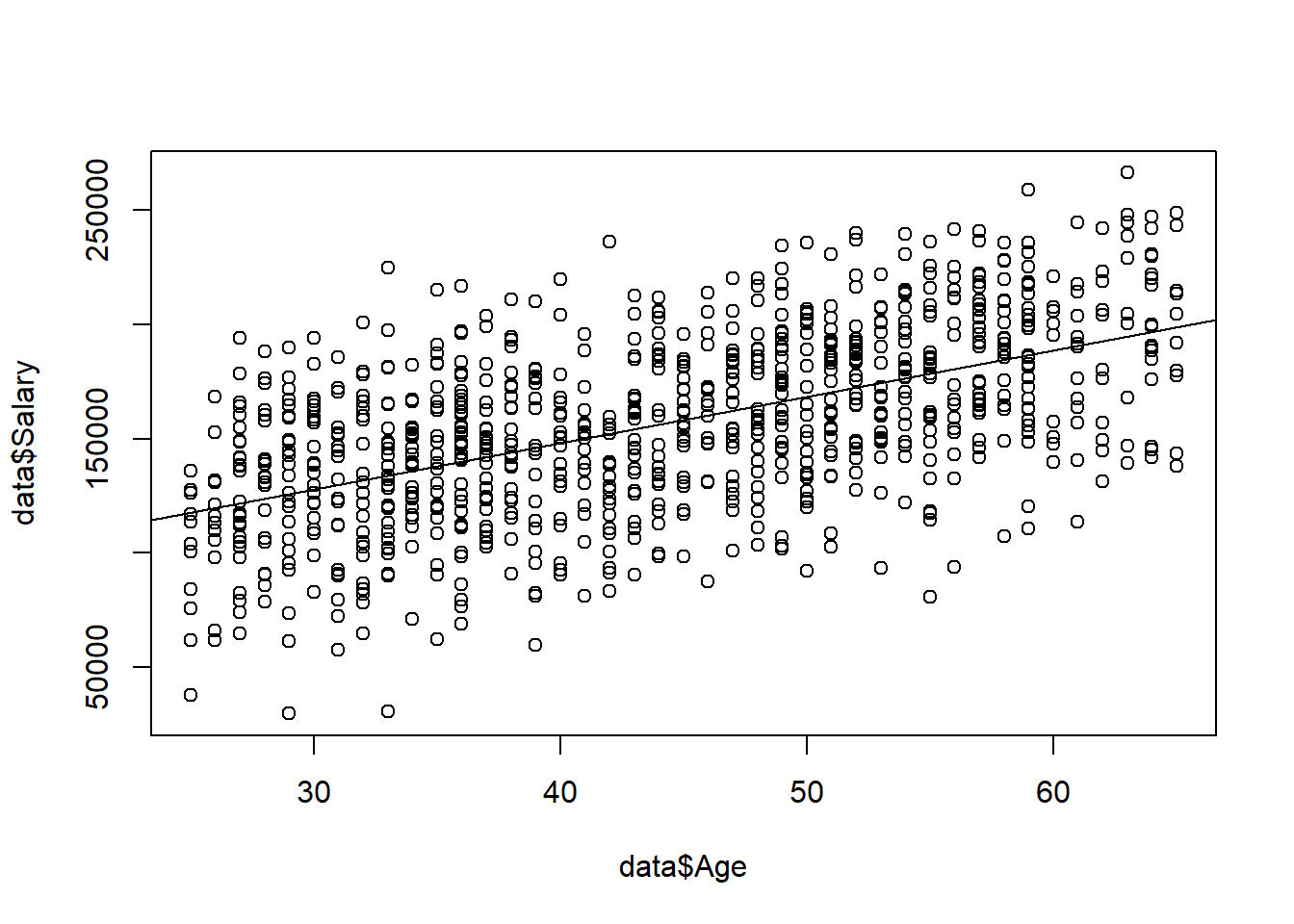 Below we use the lm() function to model the Salary variable as a function of the Age variable from data.