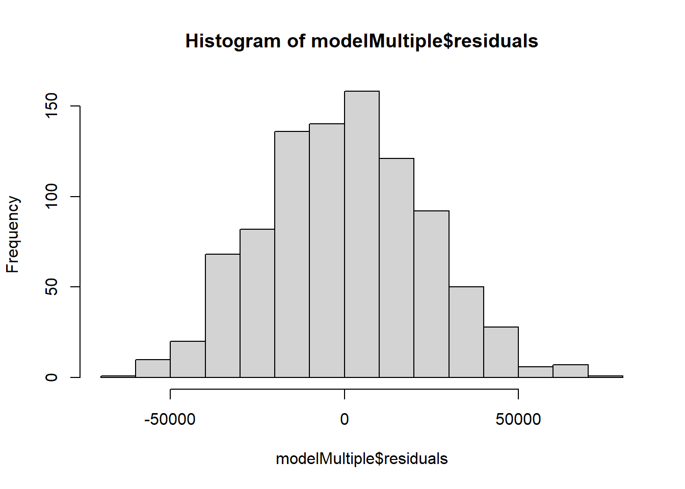 To test the normality assumption of our multiple linear regression model, we can look at a histogram and boxplot of the model’s residuals: