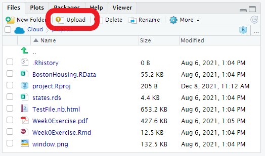 To read in data from a file, that file must be stored in the RStudio Cloud project you are working within. Typically, the data files you need will come pre-loaded in the projects we share with you. However, if you need to upload your own data file, you can do so by clicking the “Upload” button in the bottom-right pane of RStudio (see image below).