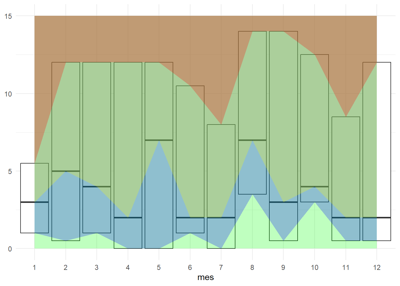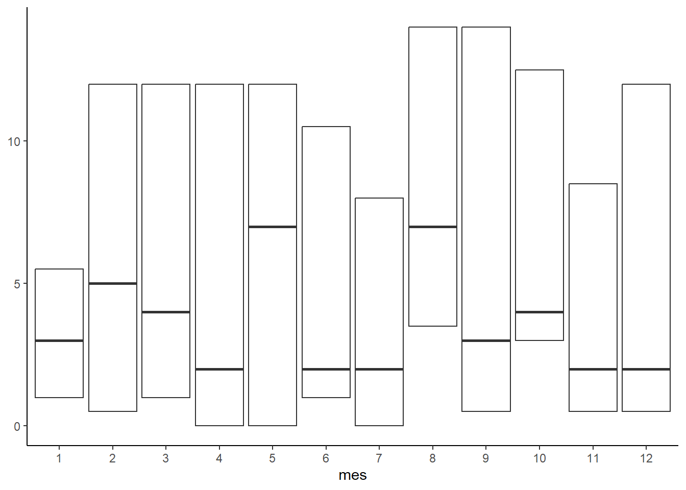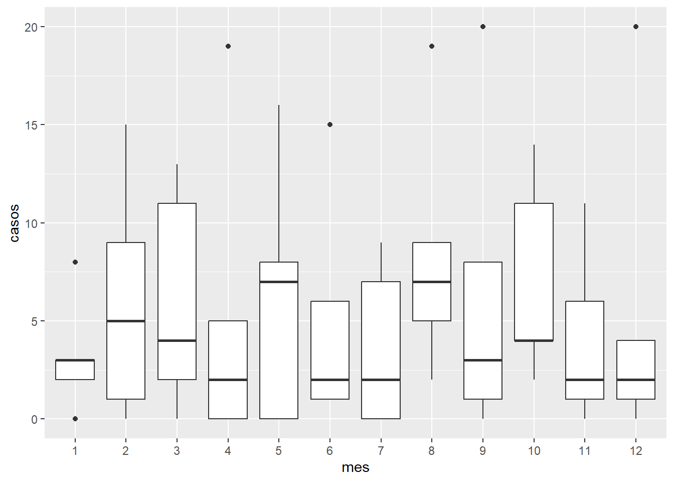 # xlab("Mes") + ylab("Casos") +ggtitle("Canal endémico PPC", subtitle = "México 1995-1999") + theme_minimal()3.1.2 Canal endémico y boxplot