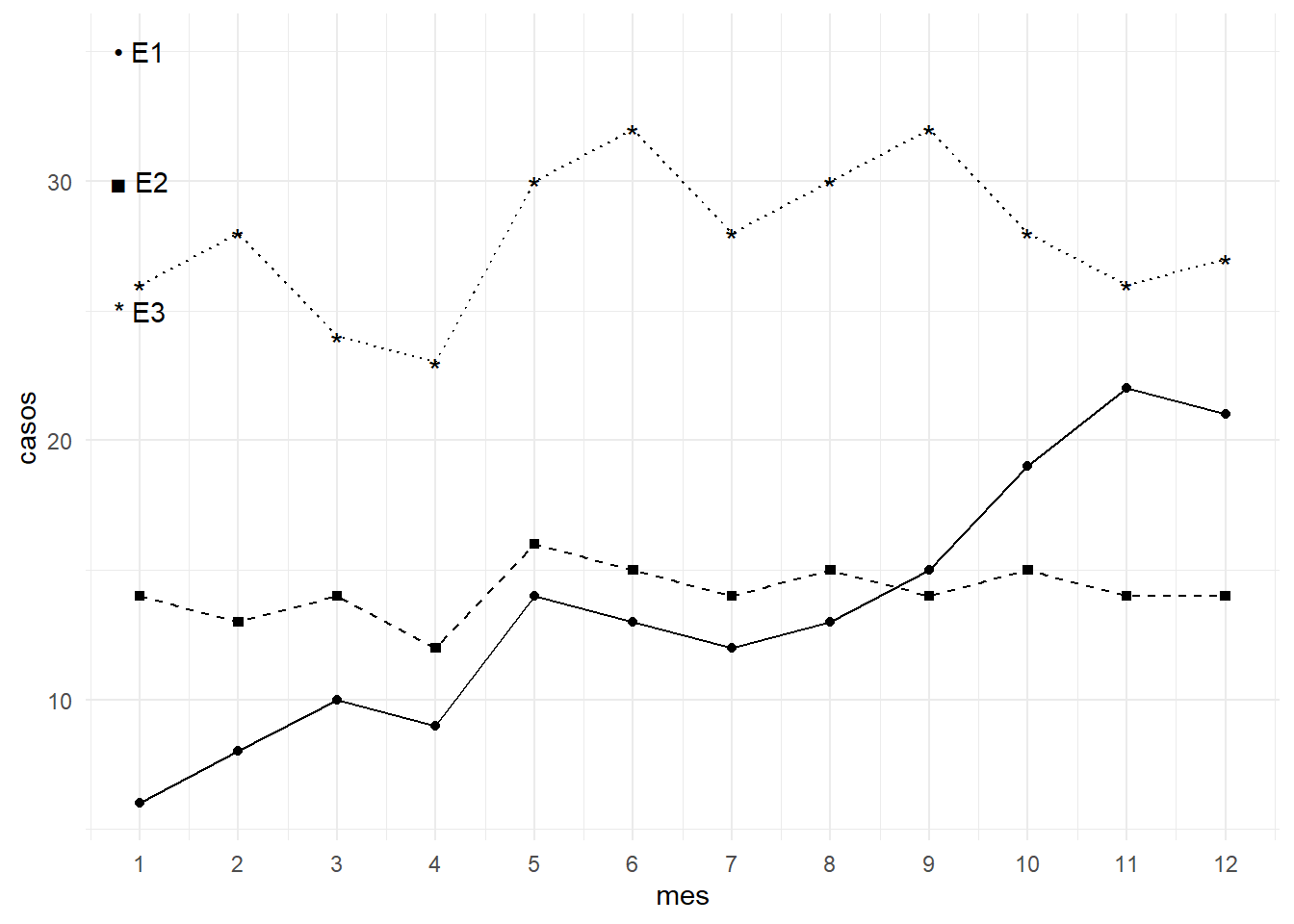 geom_line(aes(e3$mes, e3$casos), linetype = 3) +