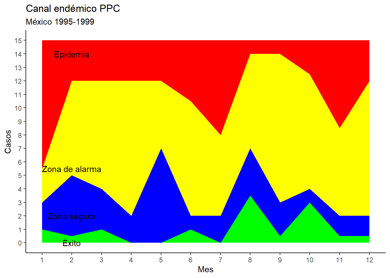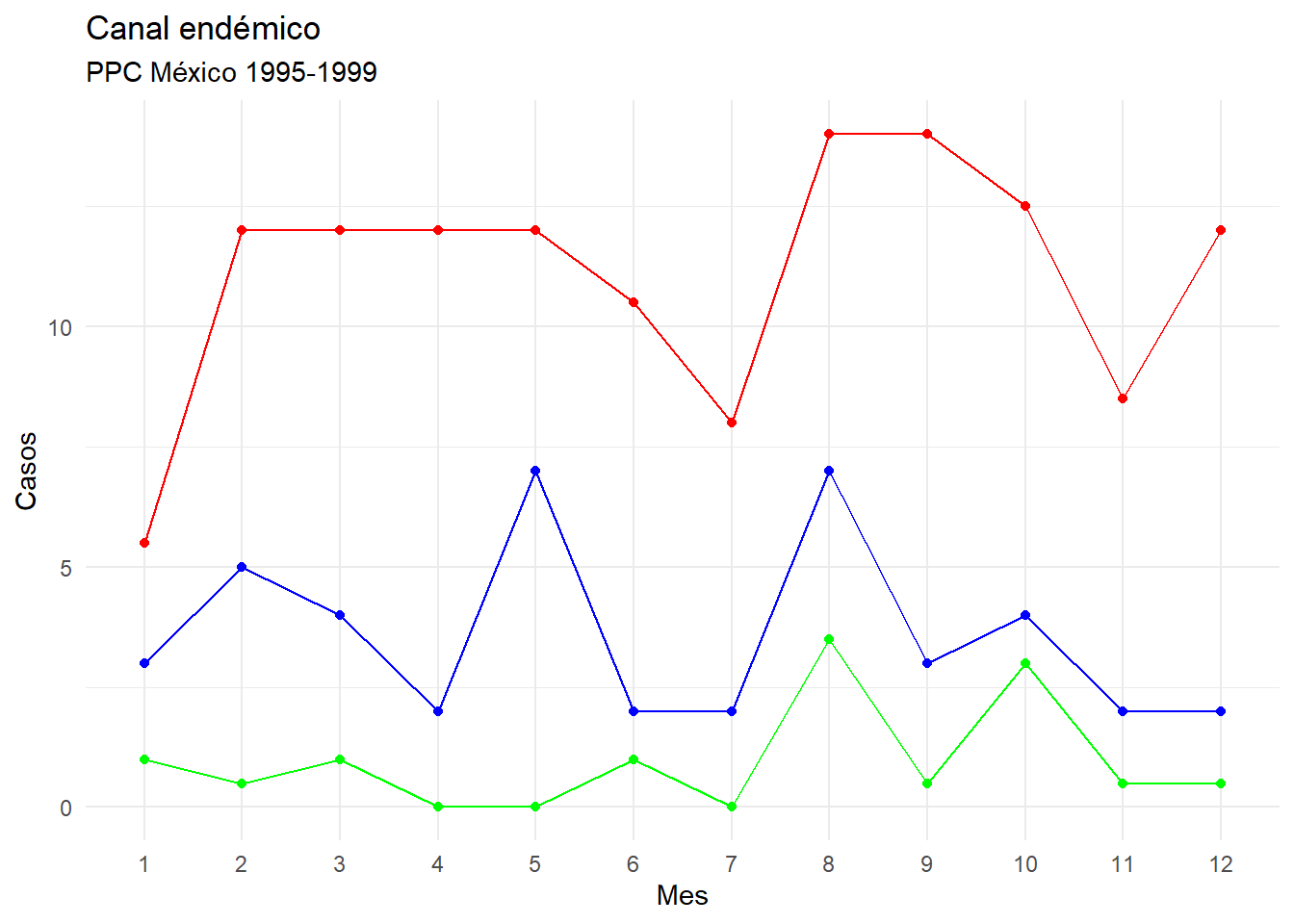 xlab("Mes") + ylab("Casos") +ggtitle("Canal endémico PPC", subtitle = "México 1995-1999") +