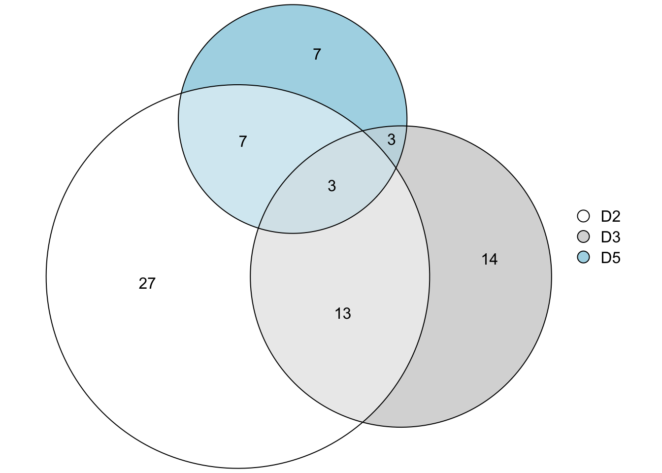 Note that the areas of the various sets and subsets (their intersection) are not in proportion to their size, but the size is indicated on the plot. Although it would be ideal if this were the case, it is not possible to draw such a diagram in general, at least not with discs. This is quantified as follows (see the package manual for details).