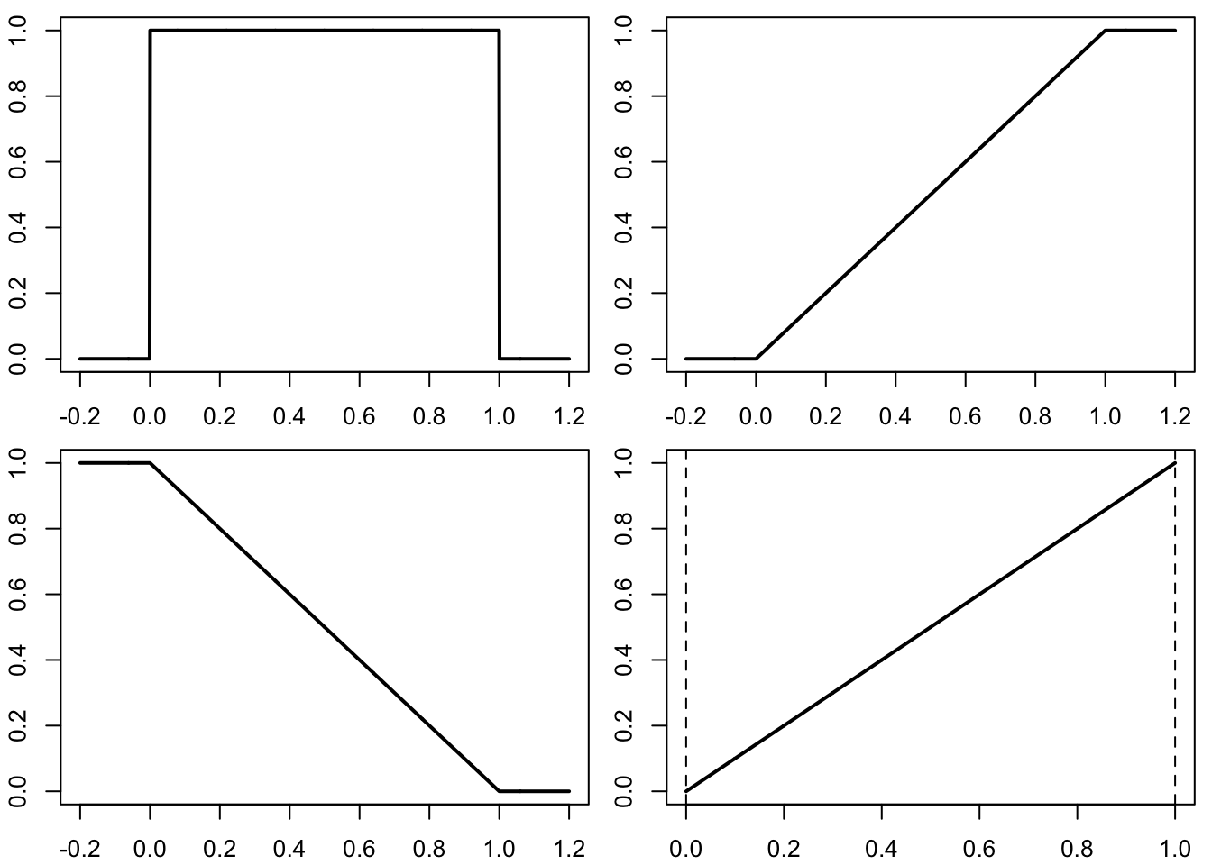 Here are the density, (cumulative) distribution function, survival function, and quantile function of the uniform distribution on \([0,1]\)